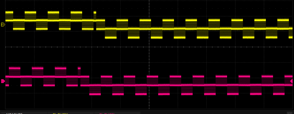 In the output, notice that the left and right channels are slightly out of phase with each other. I'm pretty sure this is simply due to how I'm setting the channels from assembly code, and the time the 6502 takes to process one command for a channel and then get to the next command for the other channel.
