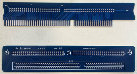 To facilitate developing new circuits for my 65816 system, I have designed an extension for my bus, leveraging the ISA physical connection on my motherboard. The extension consists of a pair of PCBs -- one that plugs into the motherboard and one that hosts an ISA connector. A pair of ribbon cables then connects the two. This allows me to work on add-in cards that are lying flat on my workbench, allowing easier access to probe and modify.