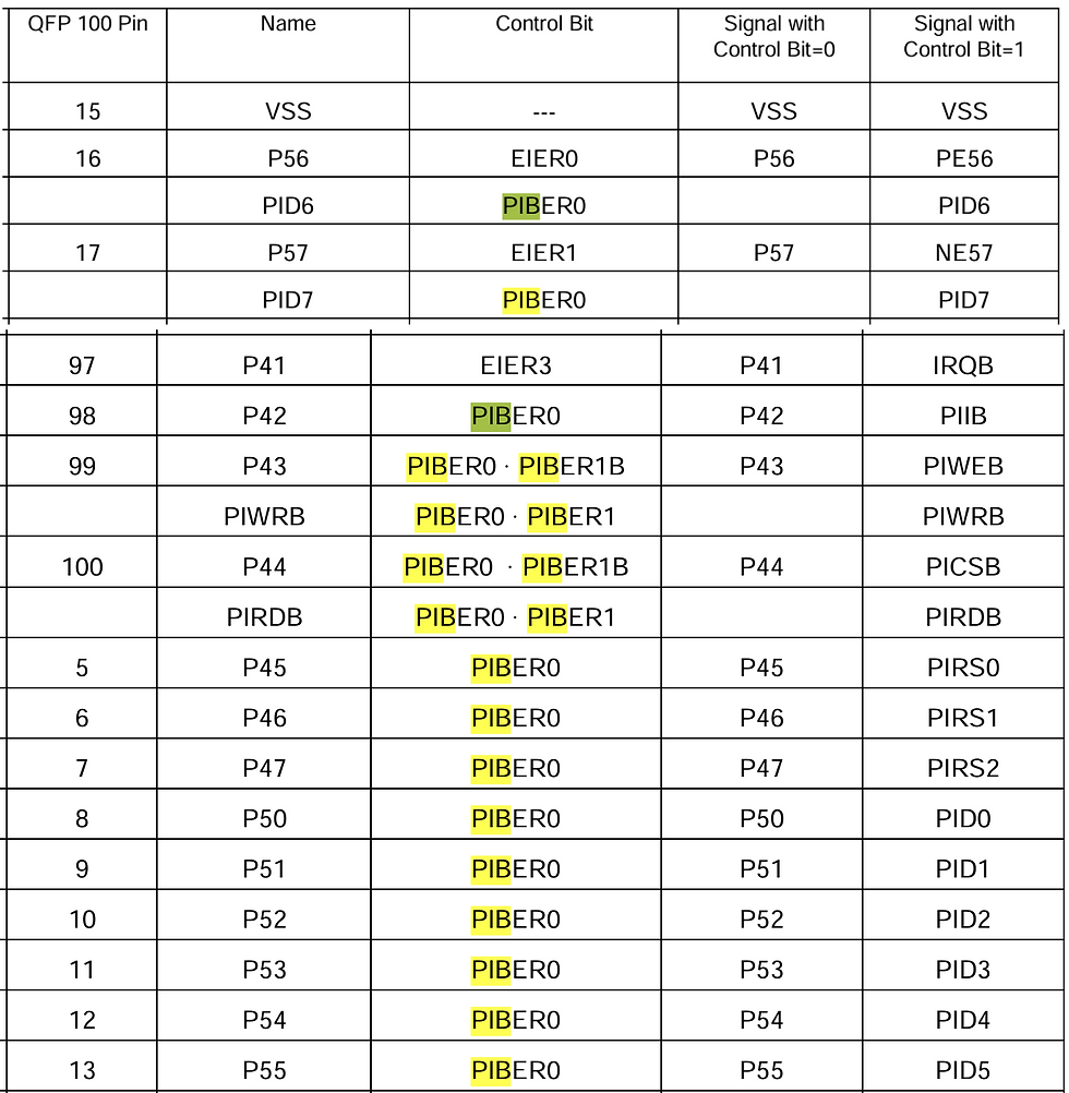 P43 | PIWEB (Parallel Interface Write Enable) / PIWRB (Parallel Interface Write Register?) The Parallel Interface Write Enable (PIWEB) input pin is used with the Parallel Interface Chip Select (low active)/Parallel Interface Chip Select (high active) (PICSB/PICS) signal to transfer data to and from the Parallel Interface Register selected by the Parallel Interface Register select (PIRSx) input pins. When PIWEB and PICSB are configured by the Parallel Interface Bus Enable Register bit 1 (PIBER1=0), then the PIB interface is compatible with WDC microprocessor WE- logical operation with the chip select PICSB input. The use of PIWEB and PICS are configured by PIBER1=1. | FA15 Used on SXB for external ROM bank select. This is an issue. |